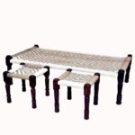 Jodhpuri Wooden Khatiya Khaat with Two Stools (White Jute)